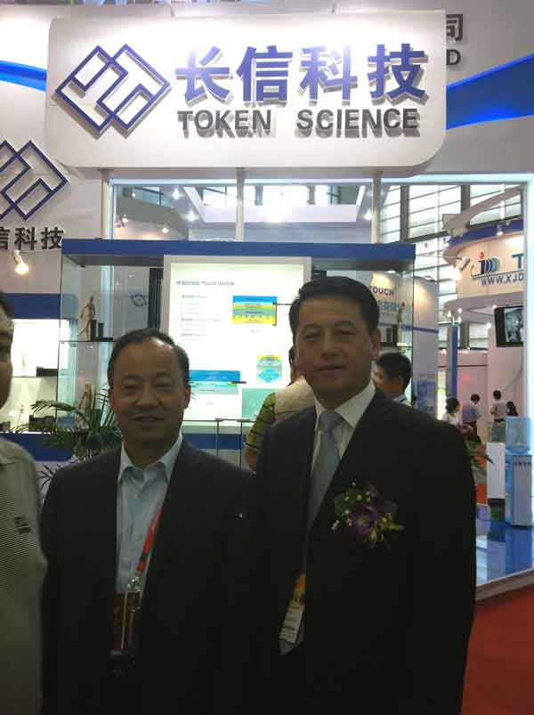 圖為國家平板顯示行業協會深圳市分會秘書長與董事長在長信科技展臺上的合影。